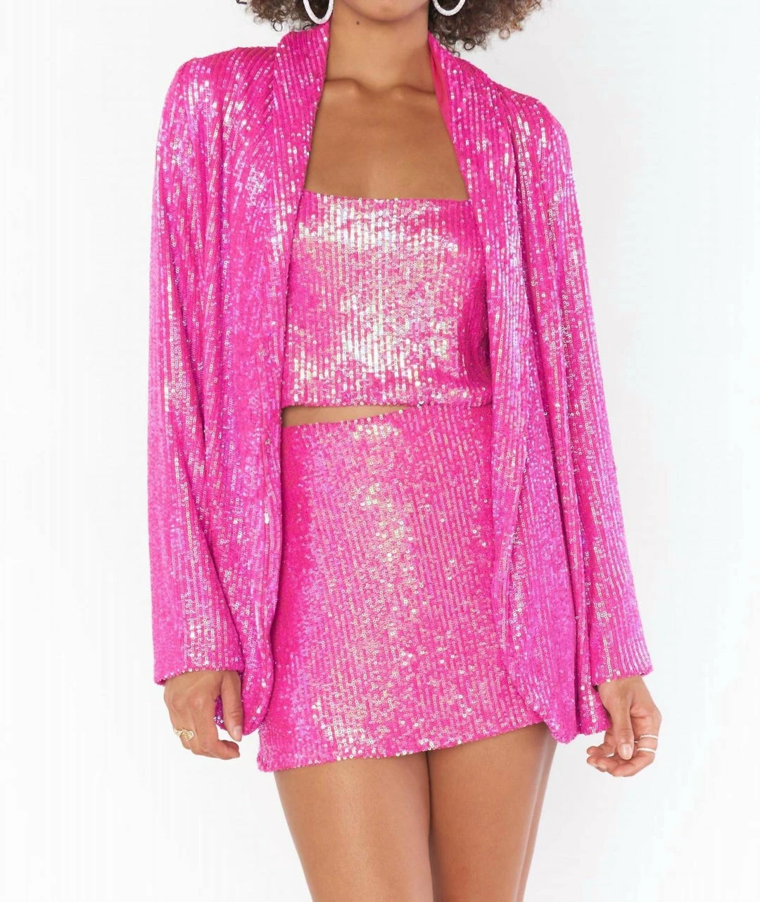 Shimmer and shine in the All Night Skort. She’s full of attitude; designed with shorts underneath and crafted in an eye catching pink sequin fabrication. The ultimate party set when paired with the Tara Crop Top and Dance Blazer in pink disco sequins.*Lined*Zipper*Elastic waist