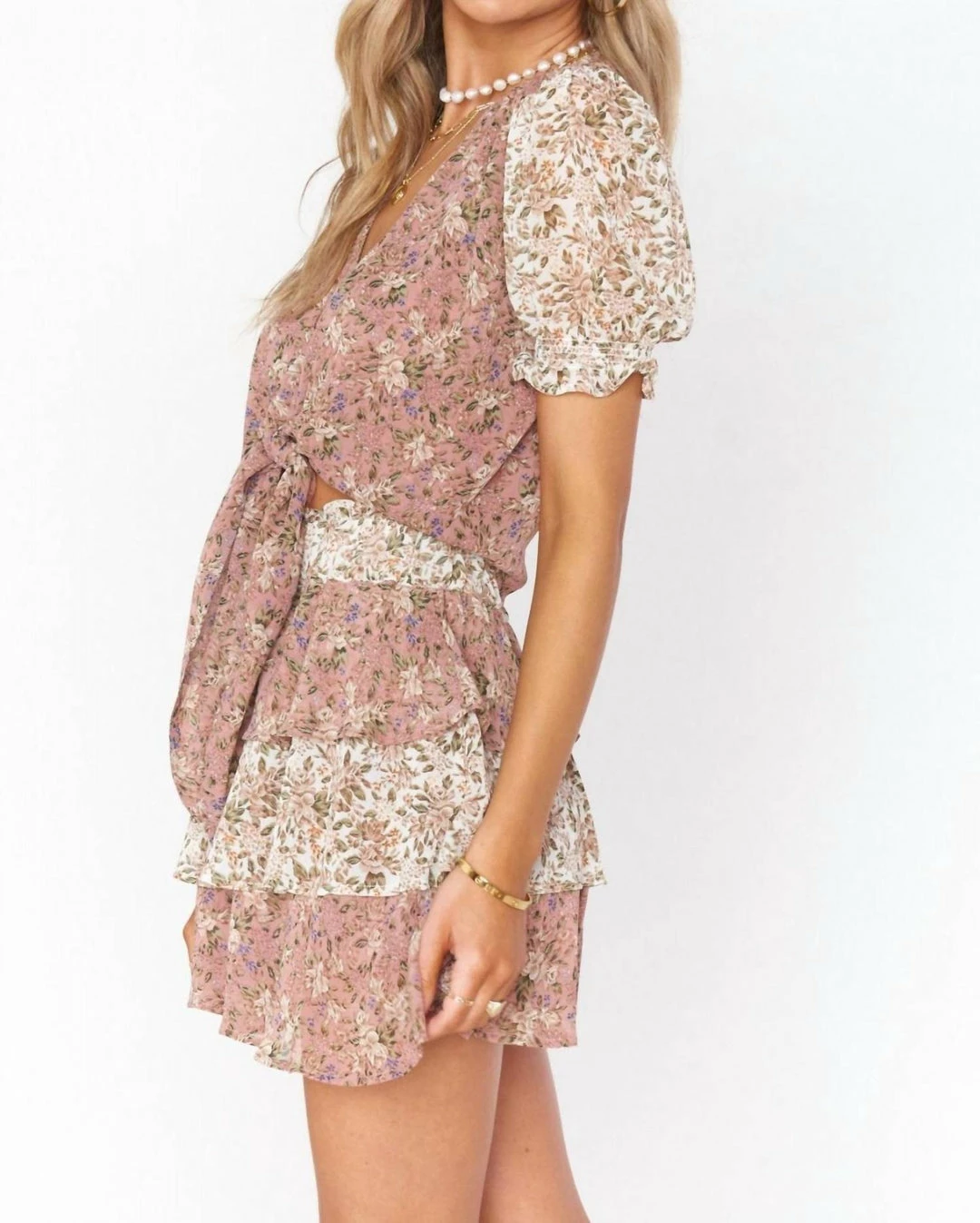 Three tiers of ruffle and an elastic smocked waist make this mixed floral mini skirt as comfortable as it is wearable. A cute little matching set with the Kimmy Tie Top or throw on a graphic tee with a perfect french tuck.ΓΒ