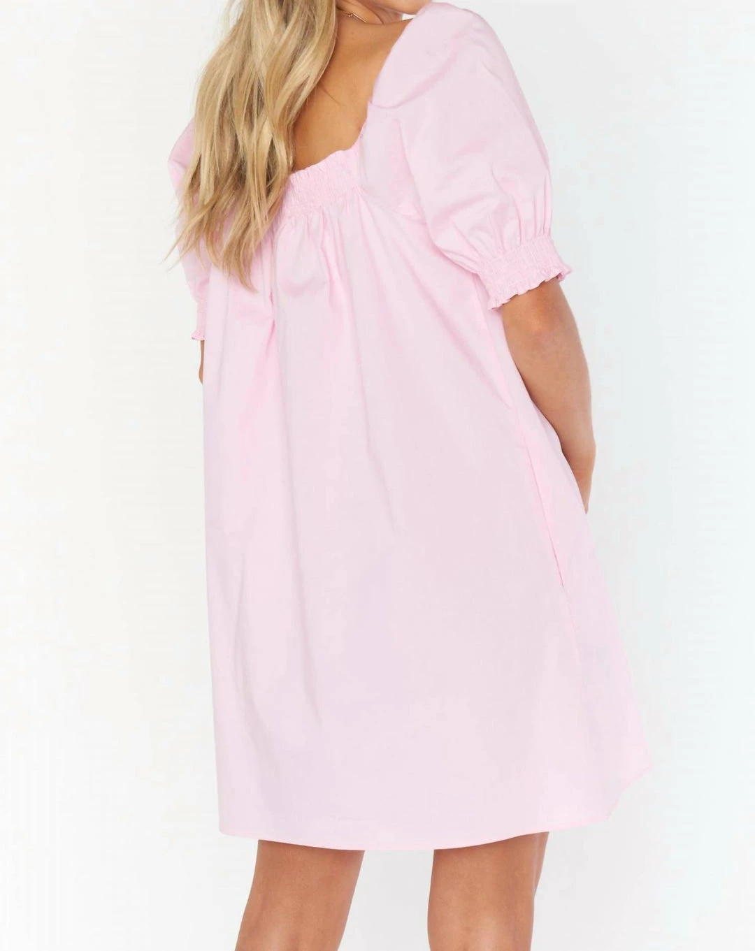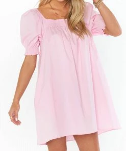 Pretty in pink in thisοΏ½οΏ½poplin mini dress. Lovely and loose, this has short puff sleeves that meetοΏ½οΏ½smocked arms and neckline. Wear with your fave boots for brunch, or heels for date night!*Smocking along top hem and sleeve openings*Pockets!*34οΏ½οΏ½1/2″ from shoulder to hem