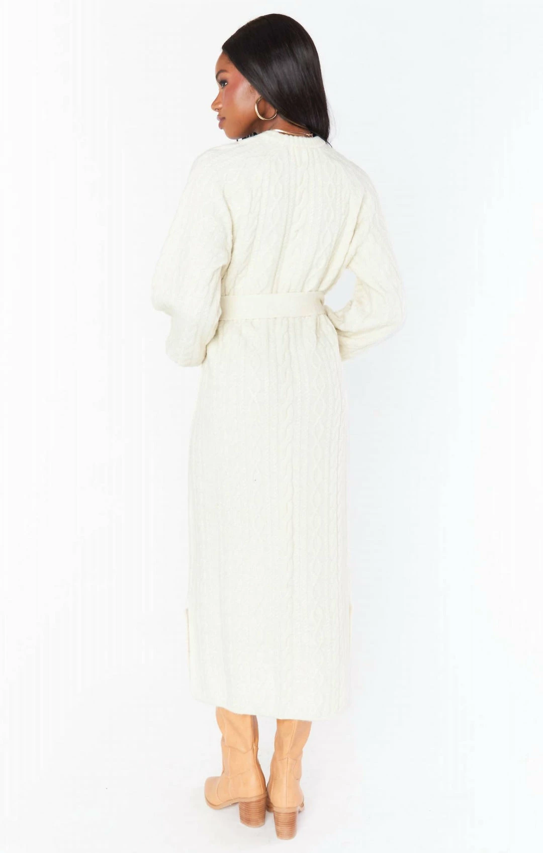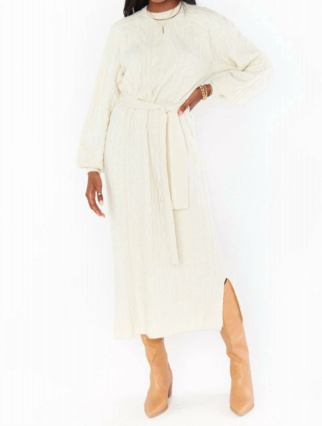 Ultra soft and comfy cable knit shapes this sweater dress with a crew neckline and relaxed bodice. The easy silhouette features a tying sash at the waist before falling to a figure-skimming midi hem with a small slit.*Self-tie belt*Side slit*52″ shoulder to hem*Imported