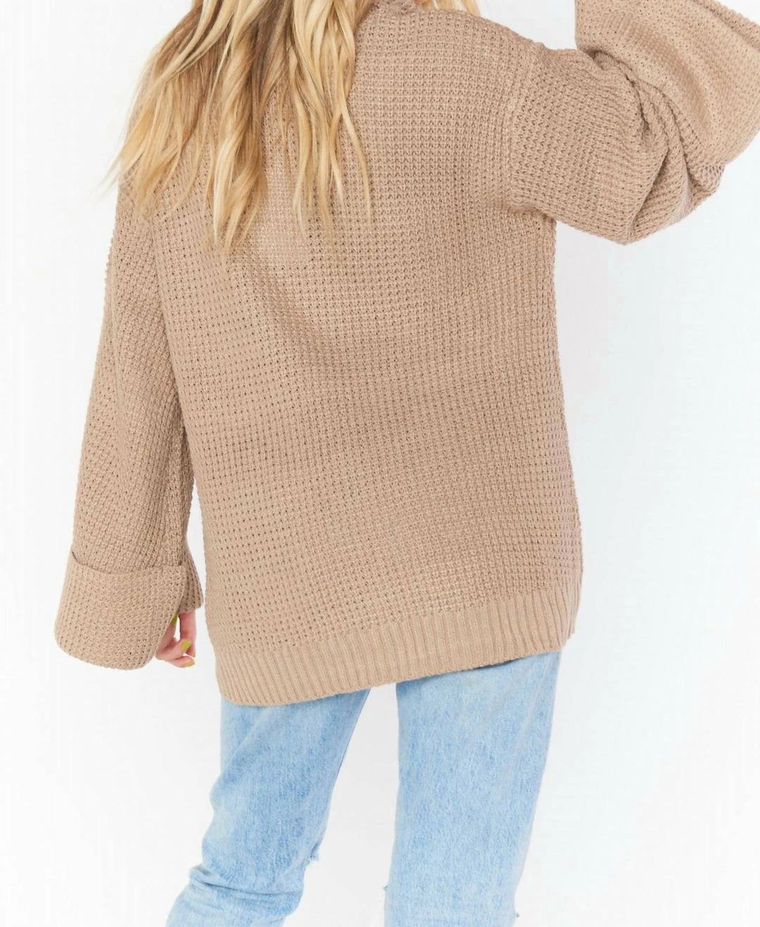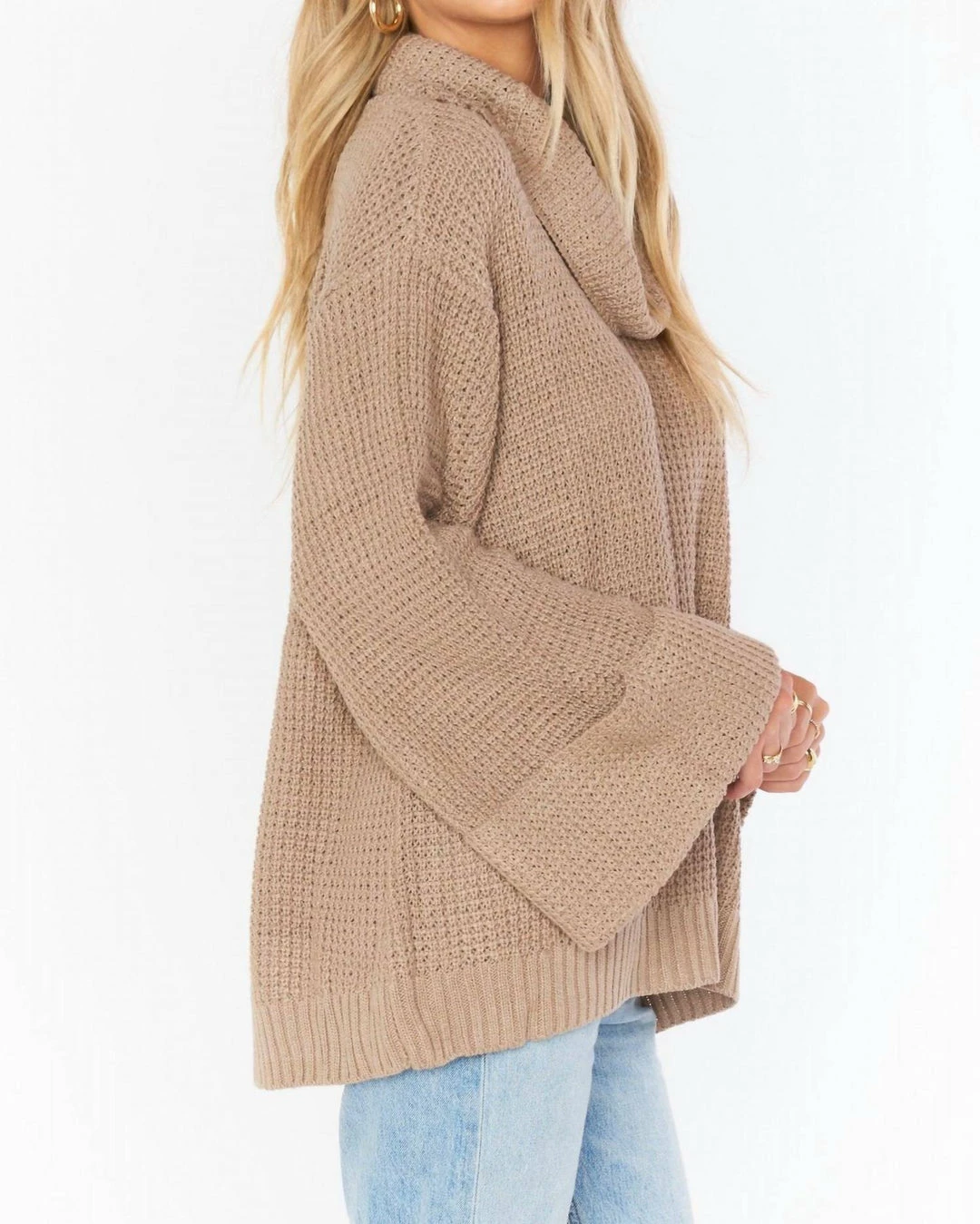 This oversized taupe turtleneck sweater is a cool weather must have. Cuffed sleeves are slightly belled and the turtleneck has a slouch to it for max comfort while still looking chic.ΓΒ