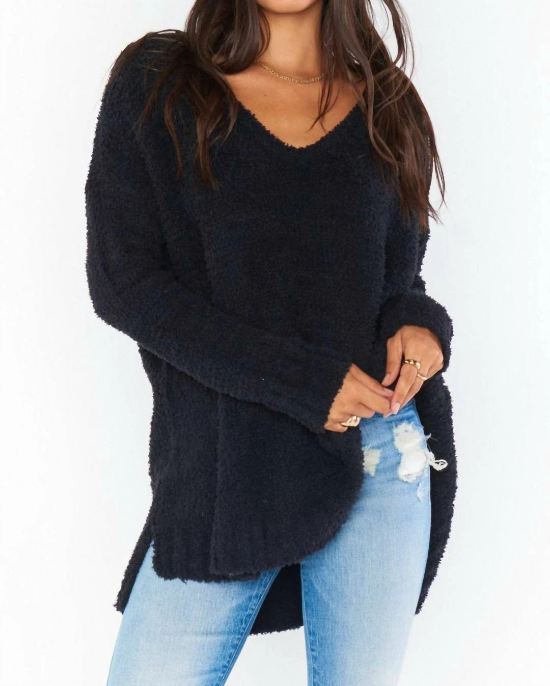 The oversized sweater that every girl needs in her closet! This fuzzy black sweater has a v-cut neckline, two side slits and a high-low hem.ΓΒ
