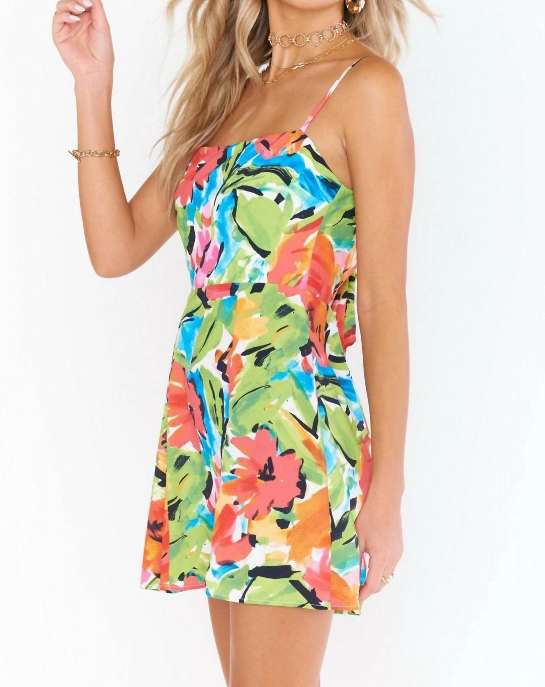 Floral mini with an open back twist! Find your perfect fit with a tie back and