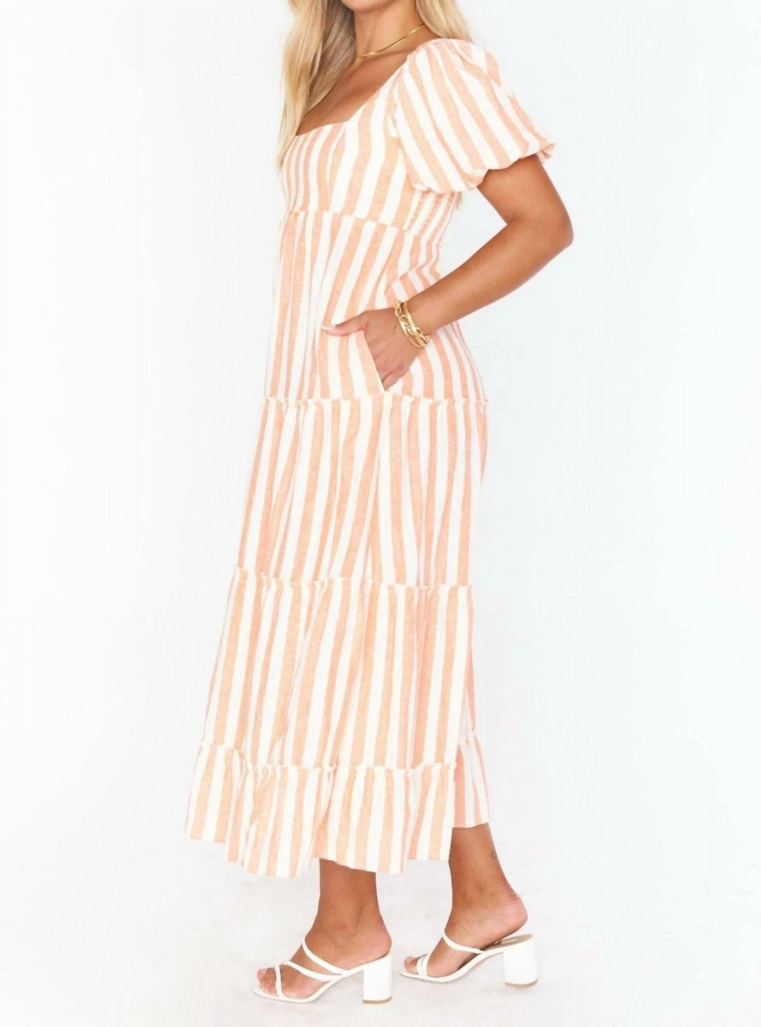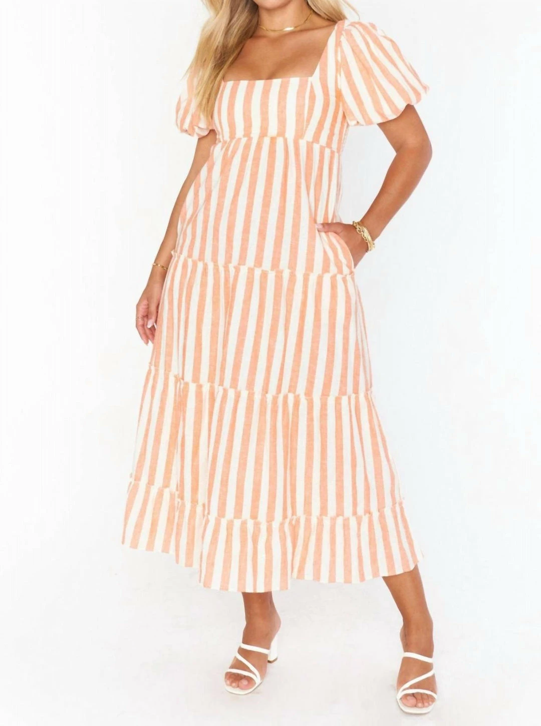 The perfect balance of boho and sophistication, this striped midi dress will be your new go-to for when you need to up the dress level. It has the golden trio – a flattering square neck, juxtaposed next to a poof sleeve, and fits to perfection with a smocked back. Met with a comfortable flowy skirt, you’re going to love this new midi.
