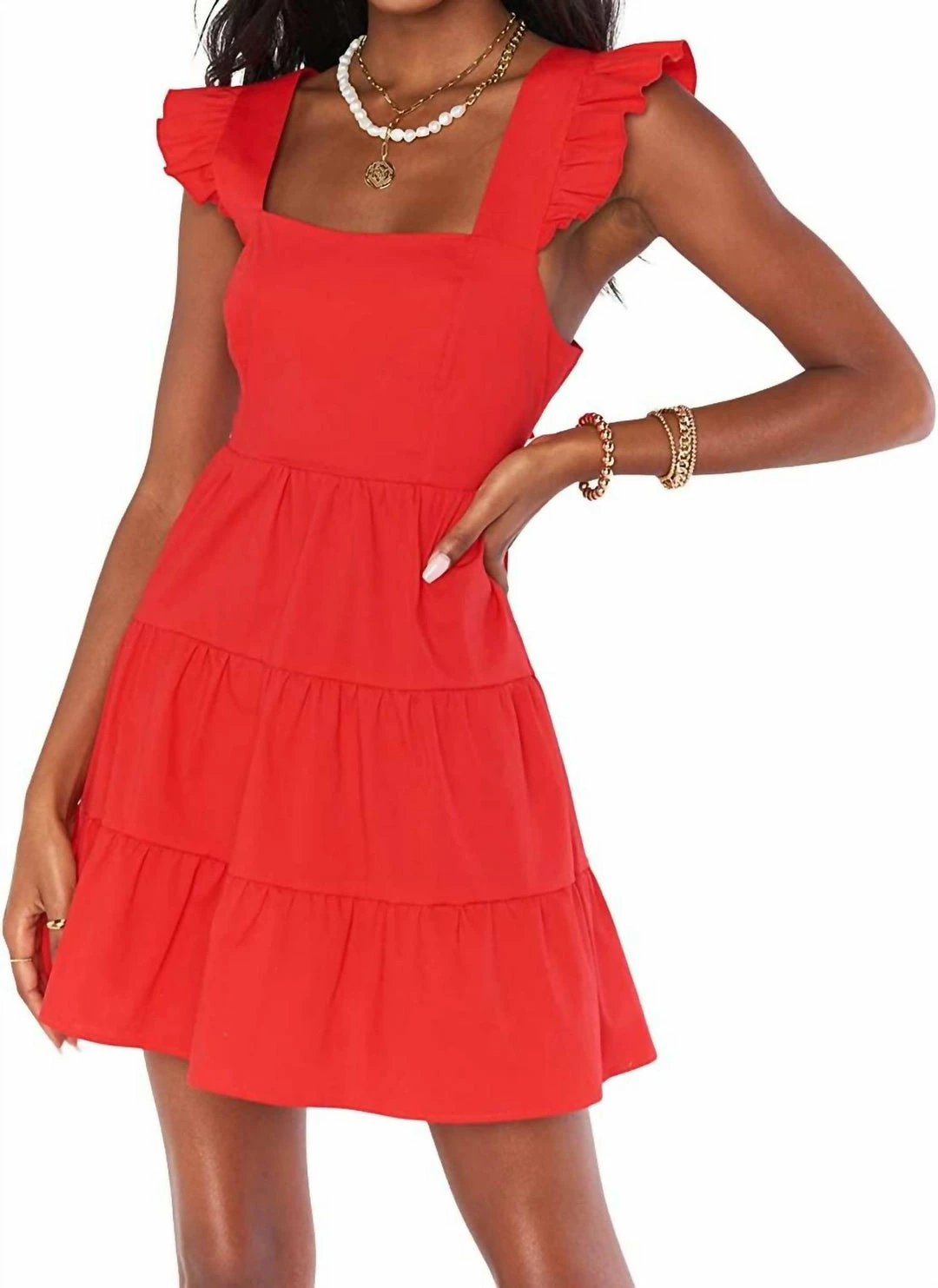 Cotton/SpandexHand wash coldLay flat to dryMini-length dress fashioned with square neckline and ruffled detailing on the shoulder edges.Tie closure on the open-style back.Tiered accent on the skirt.98% cotton, 2% spandex.Machine wash, tumble dry.Made in the USA