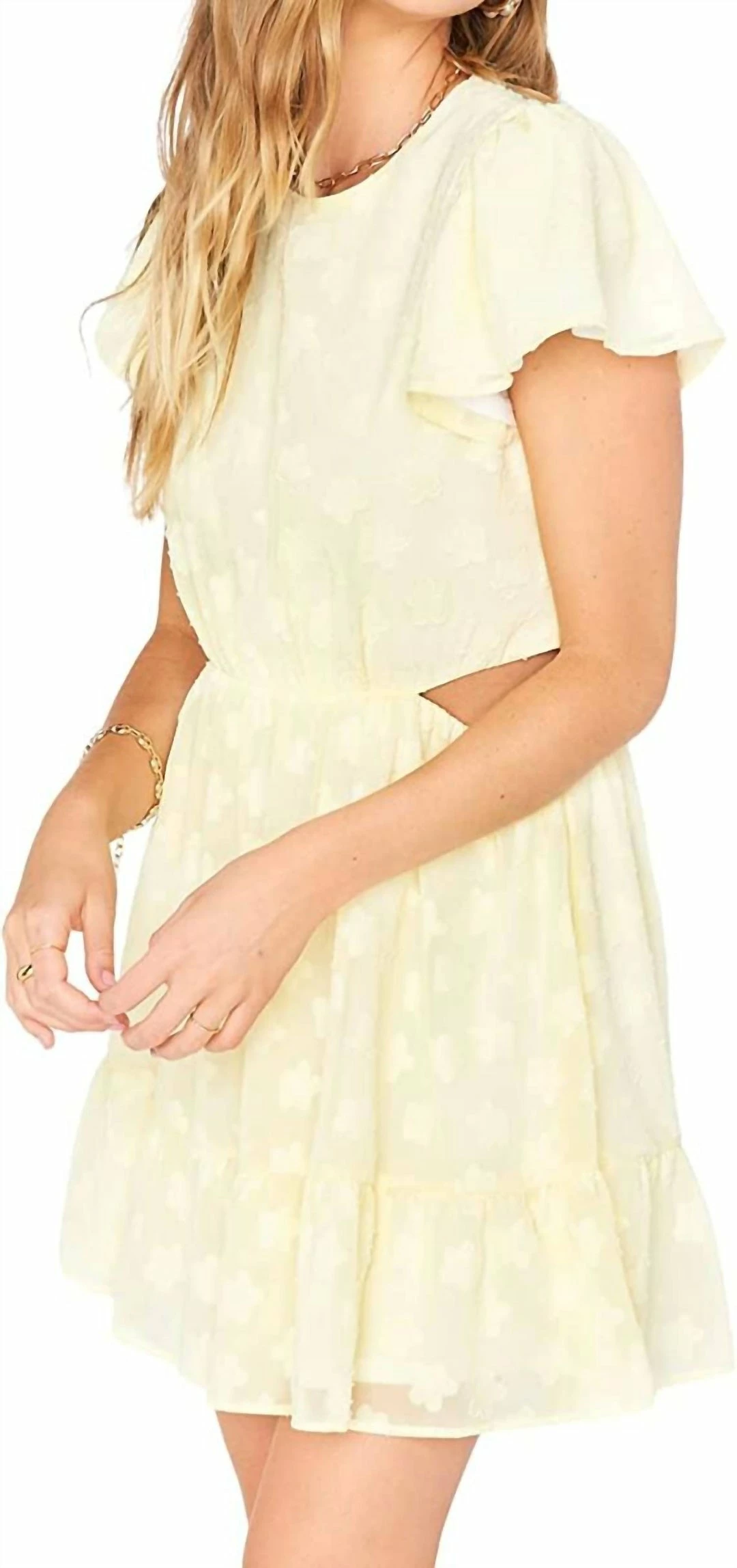 Hand wash coldLay flat to dryPolyesterMade in the USA or ImportedPull-on closuremachine washDress to impress and express your minimalist style in the Show Me Your Mumu Merritt Mini Dress.Fitted bodice and flowing skirt.Round neck and short flared sleeves.Cut out details at the waist.Straight hem that hits just below the hip