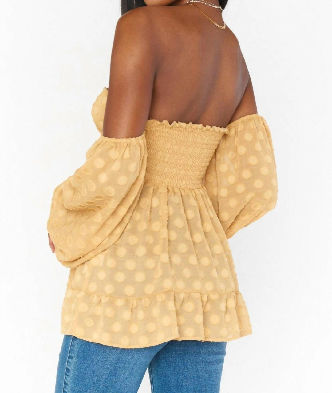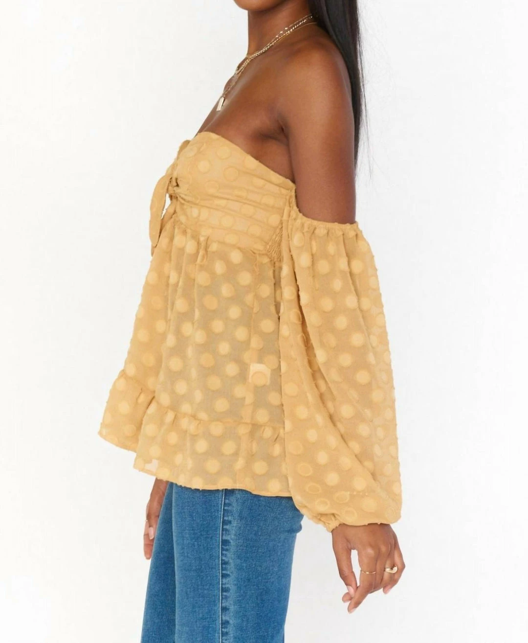 Be a 70’s boho dream in this gold dot statement top. Adjustable front tie, smocked back and elastic sleeves will leave you styled to perfection.