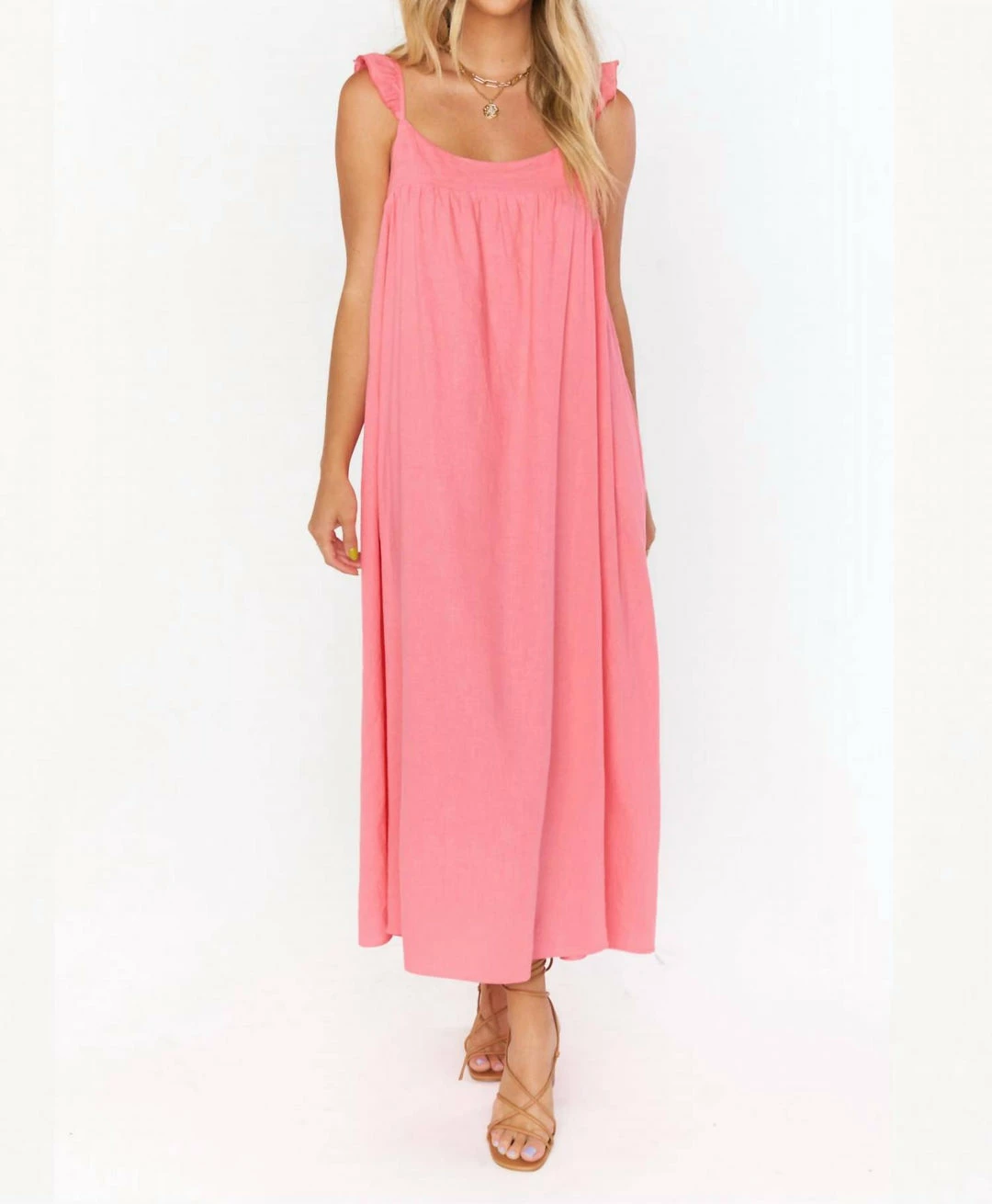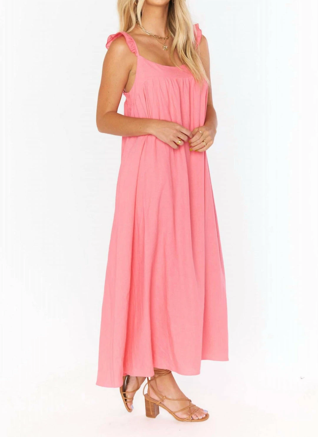 Made in the USA!ΓΒ The Oasis Ruffle Dress will bring a dose of joy to any look! Breezy pink linen shapes this maxi that has a loose, easy fit and ruffled straps. This flowy maxi dress can easily go from day to night by swapping sandals for heels.Product DetailsΓΒ *Linen*55% Linen, 45% Rayon*Ruffled adjustable straps*Smocked back*Pockets*51 1/4″ from shoulder to hem
