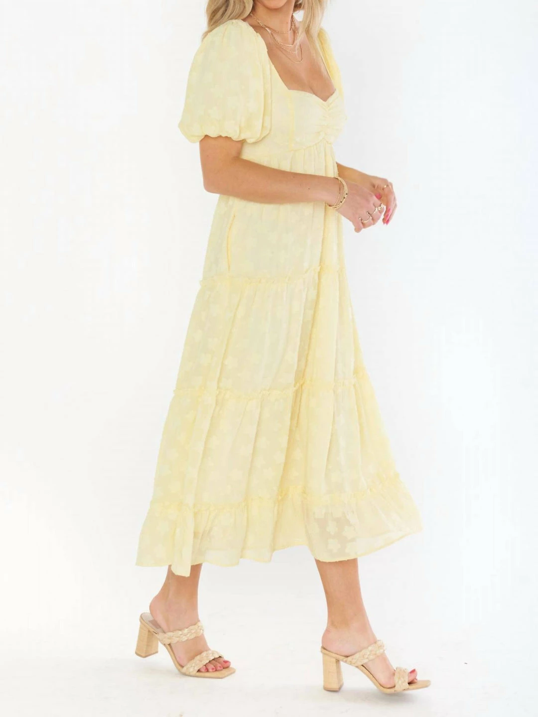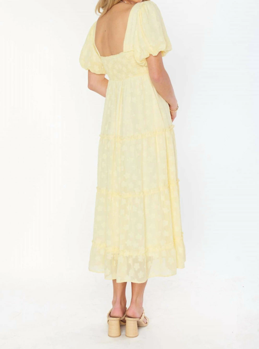 Darling details with a poof sleeve and sweetheart neckline and fits to perfection with a smocked back.*Chiffon – *Lined*Smocked back*49″ from shoulder to hem