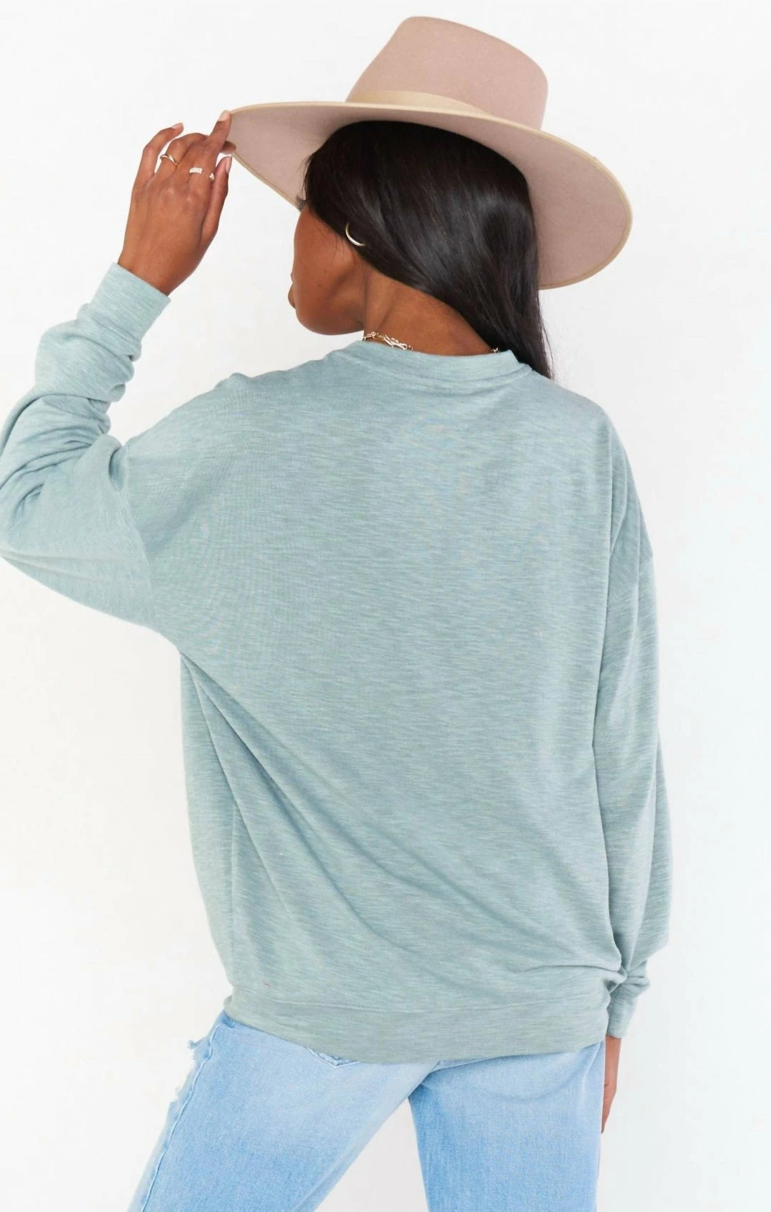 Easy outfit with this Easy Tiger graphic sweatshirt. Bop around town in this lightweight turquoise crew neck and your favorite denim and booties.