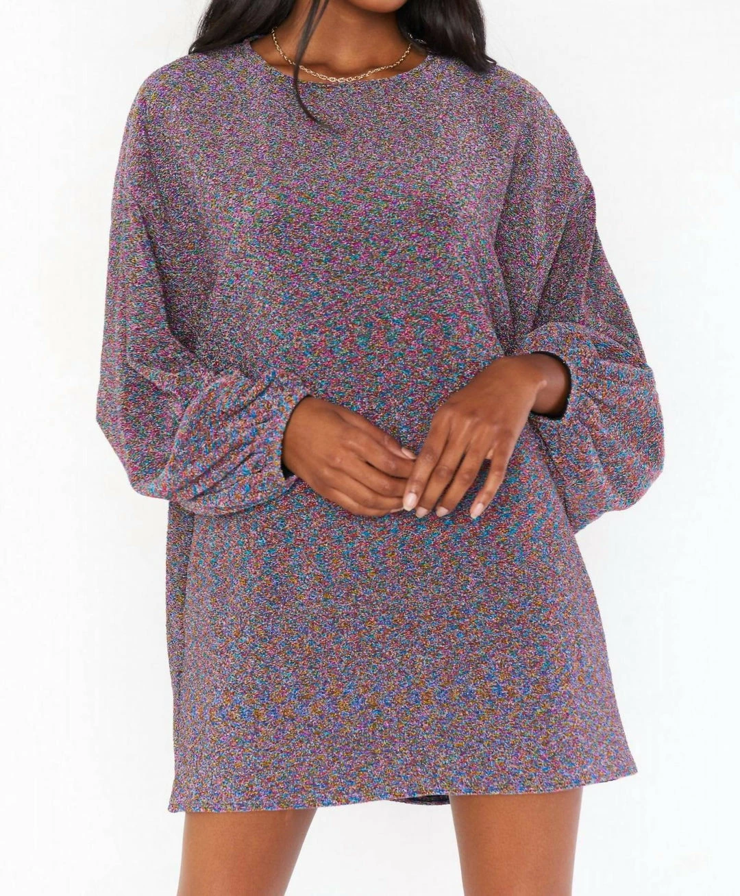 This bubble sleeve sparkly rainbow mini dressExtra sassy with drop shoulders and pockets added to our classic scoop neck and simple draped dress. *Stretch – *Elastic at wrists