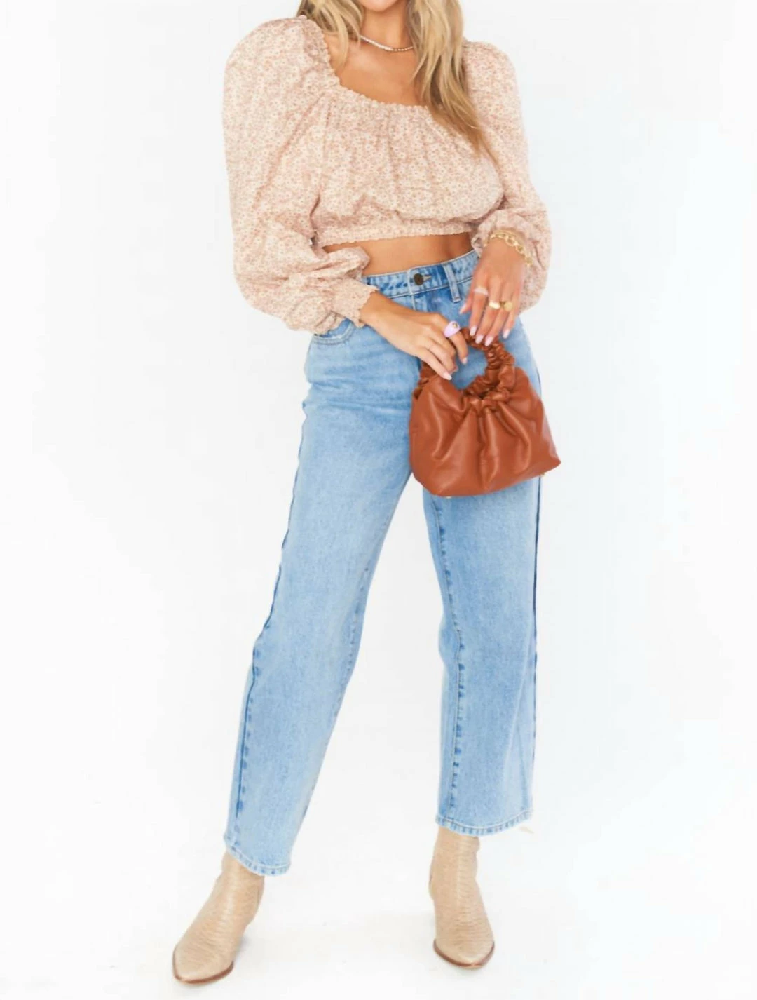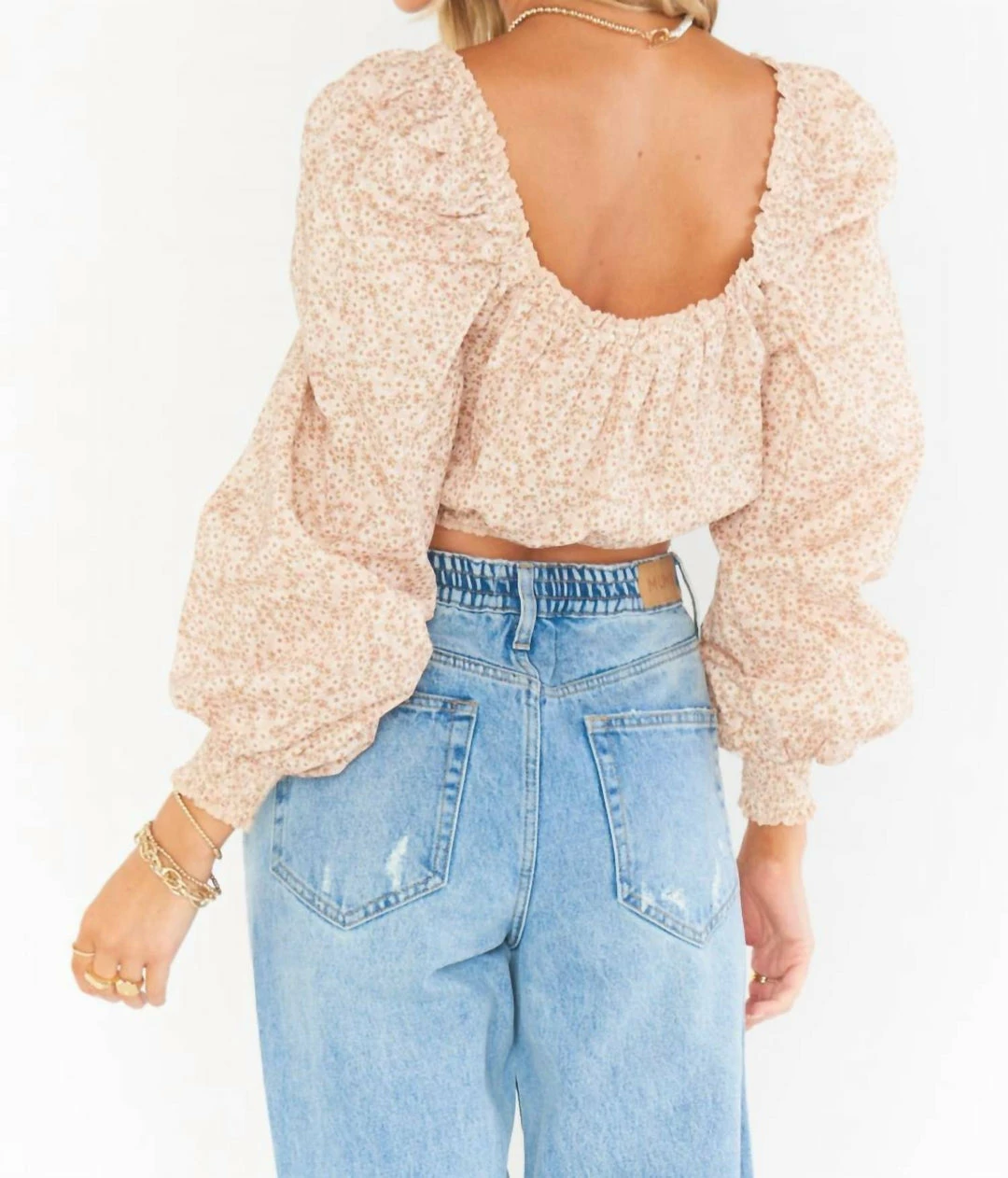 Sweeten up your wardrobe with the Suzanna Crop Top. Lightweight fabric decorated with a dainty floral print create this long sleeve blouse. An elastic square neckline allows you to wear it on or off the shoulder, while a cinched hem flatters the waist.