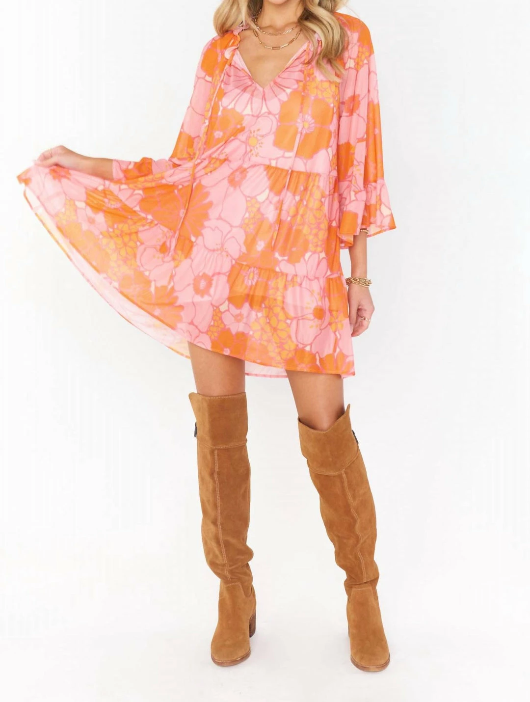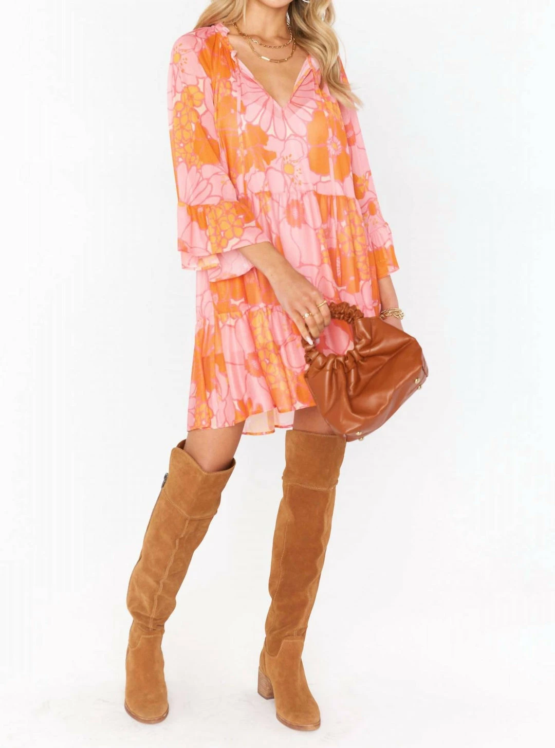 Made in the USA!ΓΒ This flirty and flowy floral mini dress has a tiered skirt and a tie front detail making it a boho dream! Soft ruffles along the 3/4 sleeves and bottom hem give a feminine touch. Top off your look with a rancher hat and gold jewelry.*95% Polyester, 5% Spandex | Lining – 96% Polyester, 4% Spandex*Slip liner*Pockets*33 1/2″ shoulder to hem
